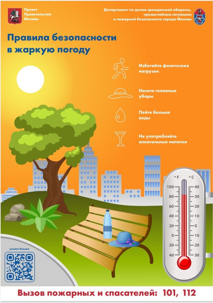 Управление по ЮАО Департамента ГОЧСиПБ советует населению в период жаркой погоды по возможности, максимально ограничить пребывание на улице, снизить физические нагрузки, выполнять работу, требующую физических усилий, в утреннее или вечернее время.
